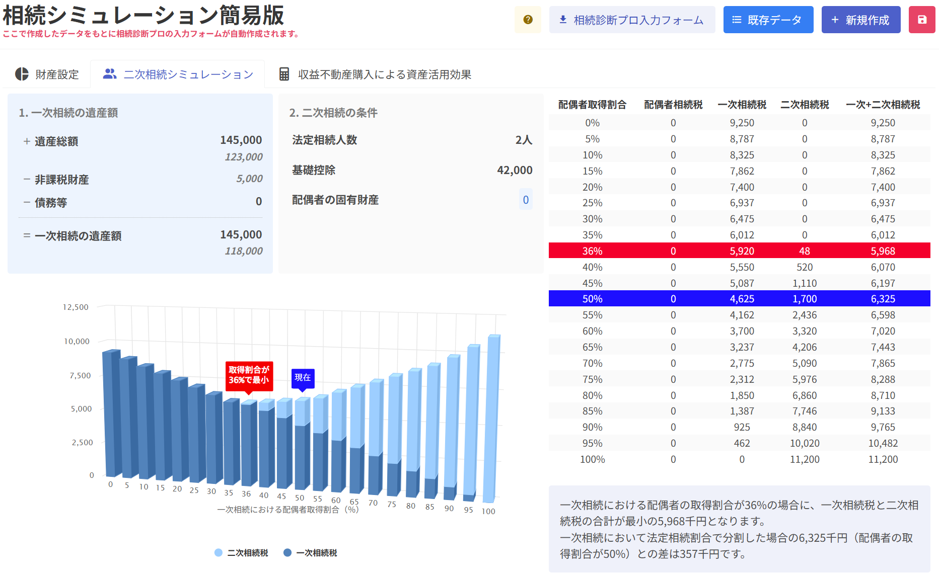 くまもと相続相談センター(一般社団法人熊本県相続相談協会)では、相続の際に、どの位の相続税が掛かるのかわからないという方向けに、簡易ソフトを使った一次二次シミュレーションの相続税額を概算で算出することも可能です。一次相続時の分割割合次第では相続税が2倍近く違う場合がありますので、相続税が最小値となる配偶者の取得割合も確認することができます。